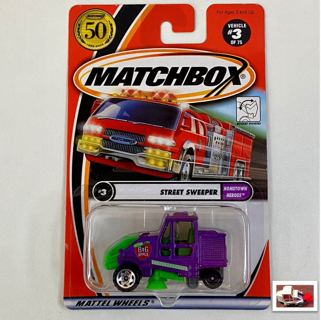 2002 Matchbox 50th Anniversary Hometown Heroes Elgin Pelican Street Sweeper morado metálico con Tolva Móvil