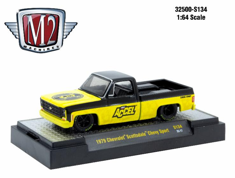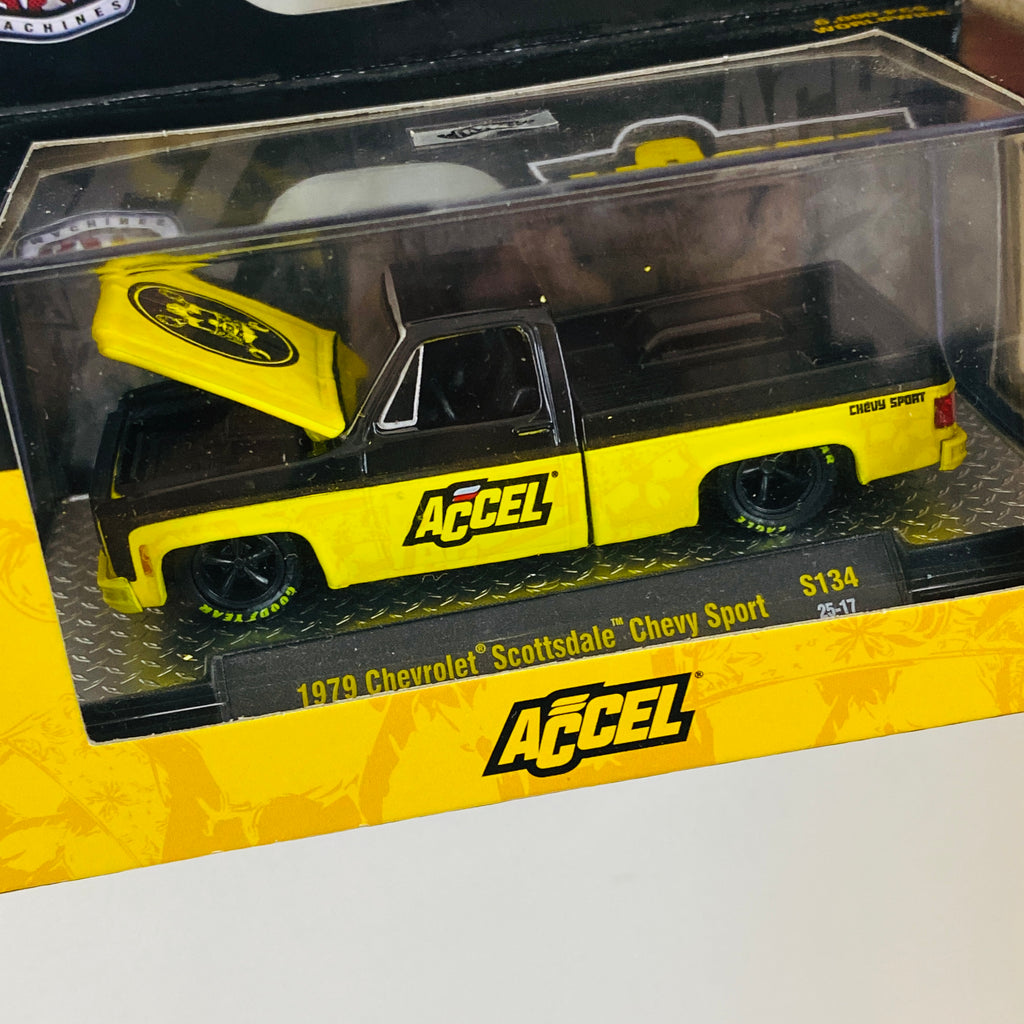 2025 M2 Machines Holley Accel Limited Edition 1/6,000 1979 Chevrolet Scottsdale Chevy Sport S134 amarillo con negro Llantas de Goma