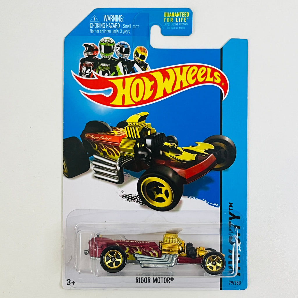 2014 Hot Wheels HW City Rigor Motor rojo metálico con flamas 5SP base ZAMAC
