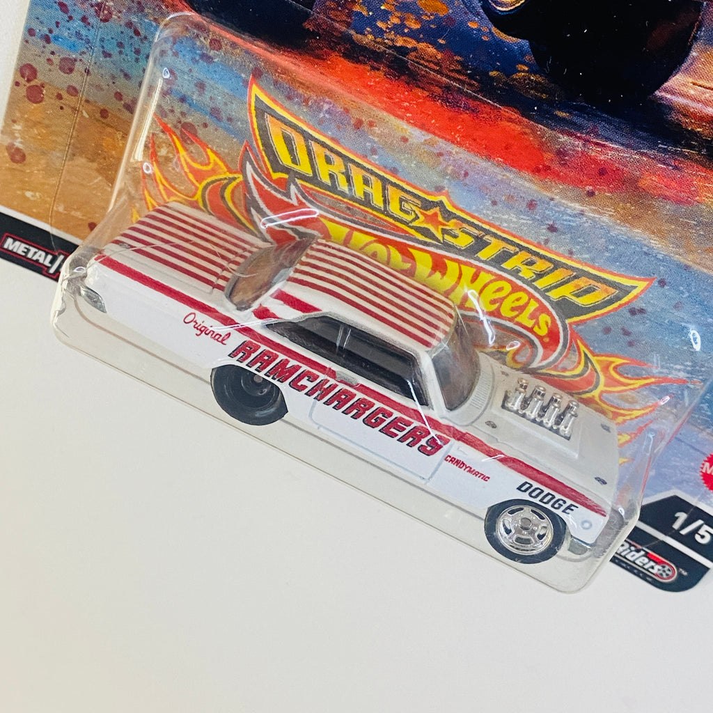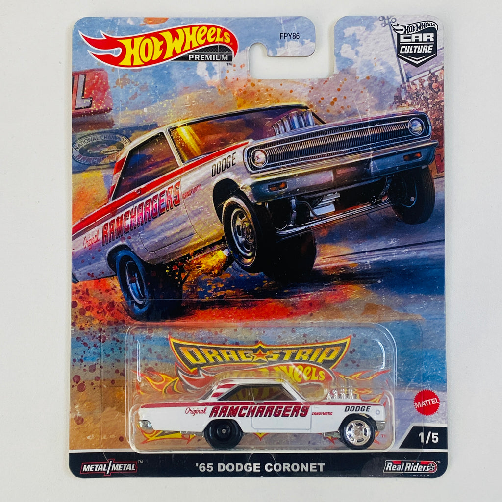 2022 Hot Wheels Premium Car Culture Dragstrip Demons 65 Dodge Coronet blanco Llantas de Goma RR base ZAMAC - Detalle Burbuja