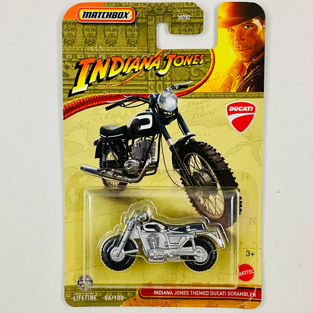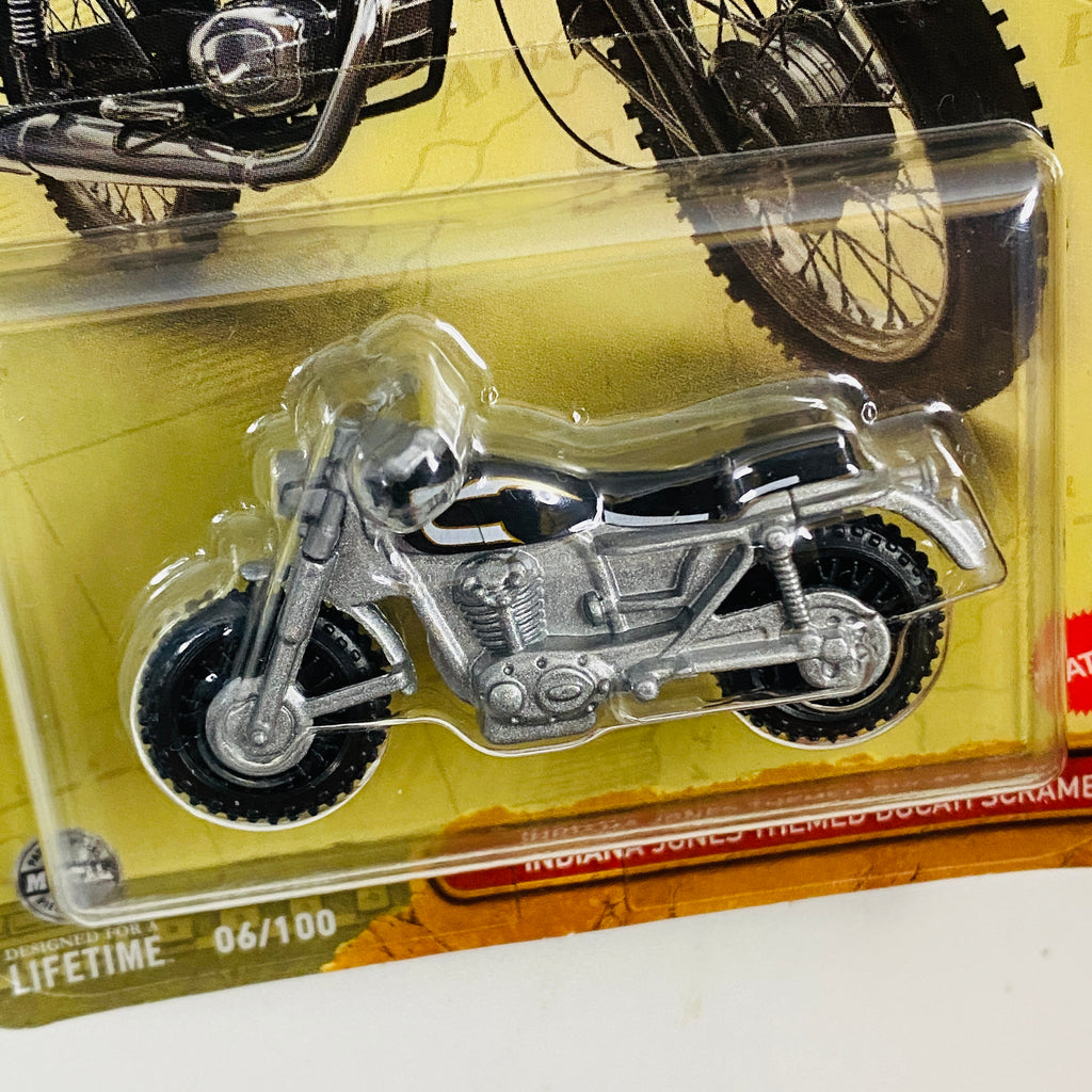 2025 Matchbox Indiana Jones Themed Ducati Scrambler negro con gris